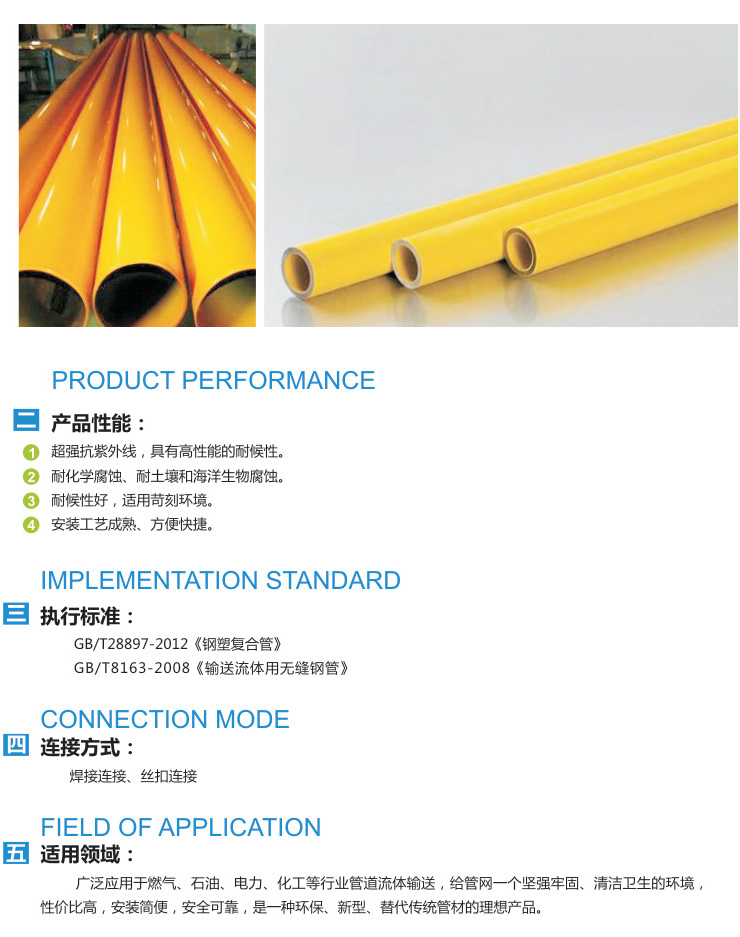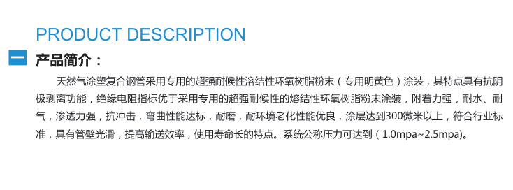 簡介:天然氣涂塑復(fù)合鋼管采用專用的超強耐候性溶結(jié)性環(huán)氧樹脂粉末(專用明黃色)涂裝,其特點具有抗明廢剝離功能,絕緣電阻指標優(yōu)于采用專用的超強耐候性的熔結(jié)性環(huán)氧樹脂粉未涂裝,附著力強,耐水、耐滲透力強